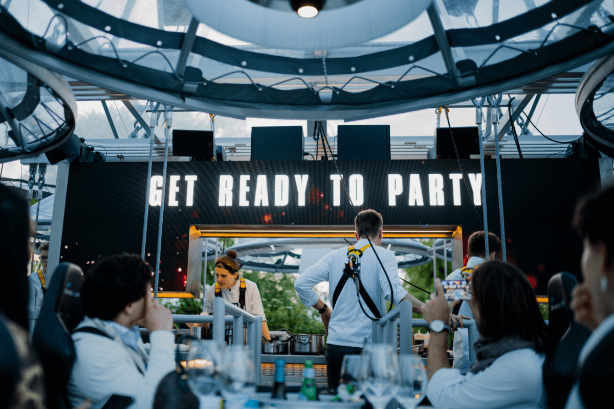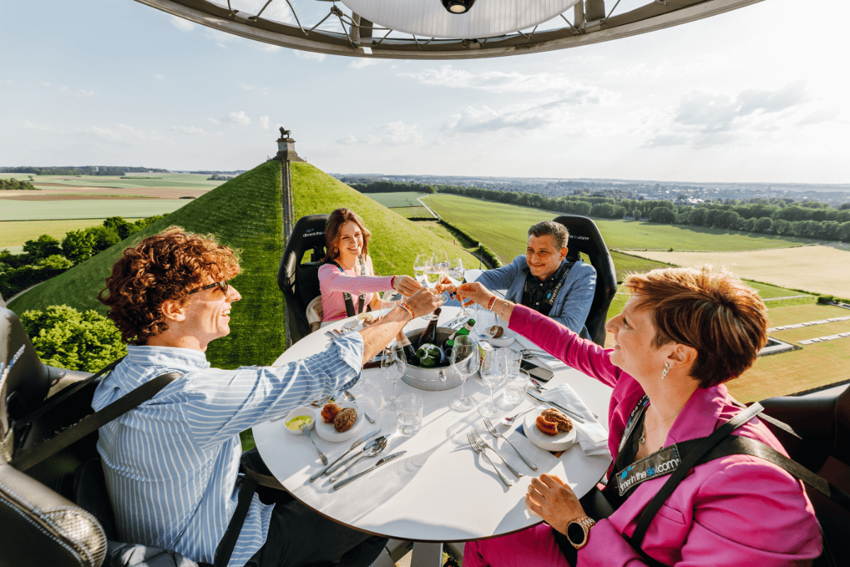 Assis sur notre nacelle 2.0, dotée de 8 tables de 4 personnes chacune, dans le cadre majestueux du Luxembourg, les invités savoureront un festin gastronomique de 5 plats préparé par un chef de renom.